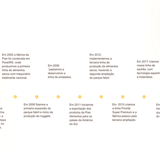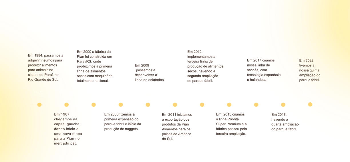 Nossa história começou em 1984, em Paraí-RS, e se mistura com a própria trajetória da família Pian. O amor que temos pelos pets deu início ao que hoje, mais de 30 anos depois, é a Pian Alimentos, uma empresa comprometida com a saúde e o bem-estar dos animais e que desenvolve produtos de alta qualidade, com um ingrediente mais que especial: